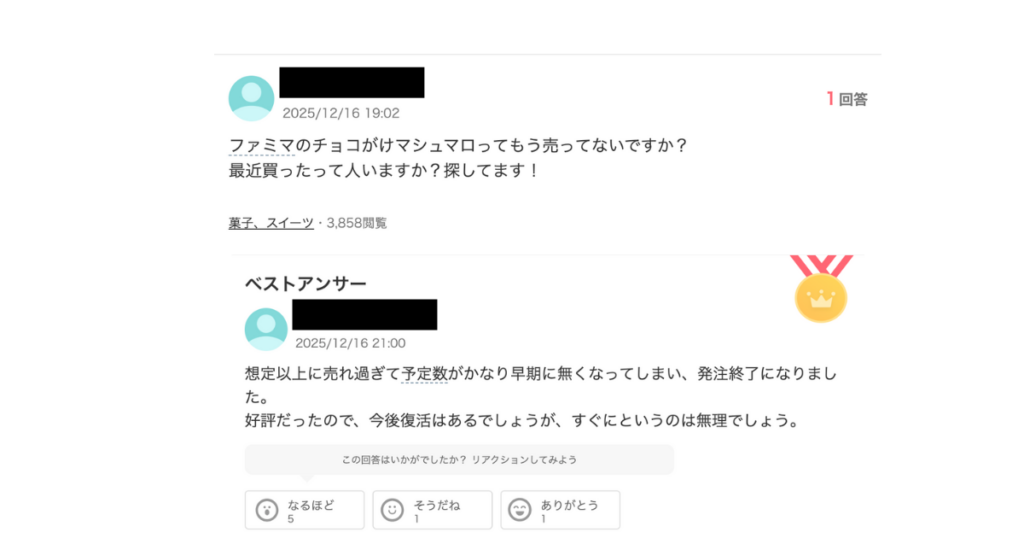 同シリーズの『チョコがけマシュマロ』もまだ再販には至っておらず、2025年12月頃には発注が終了したという噂も。