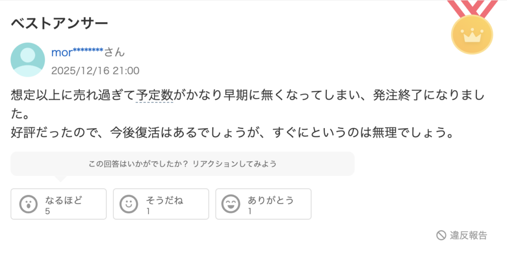 また、話題性や好評の具合で再販の可能性は高く、時期としては来年か早くて半年後と考えられます。